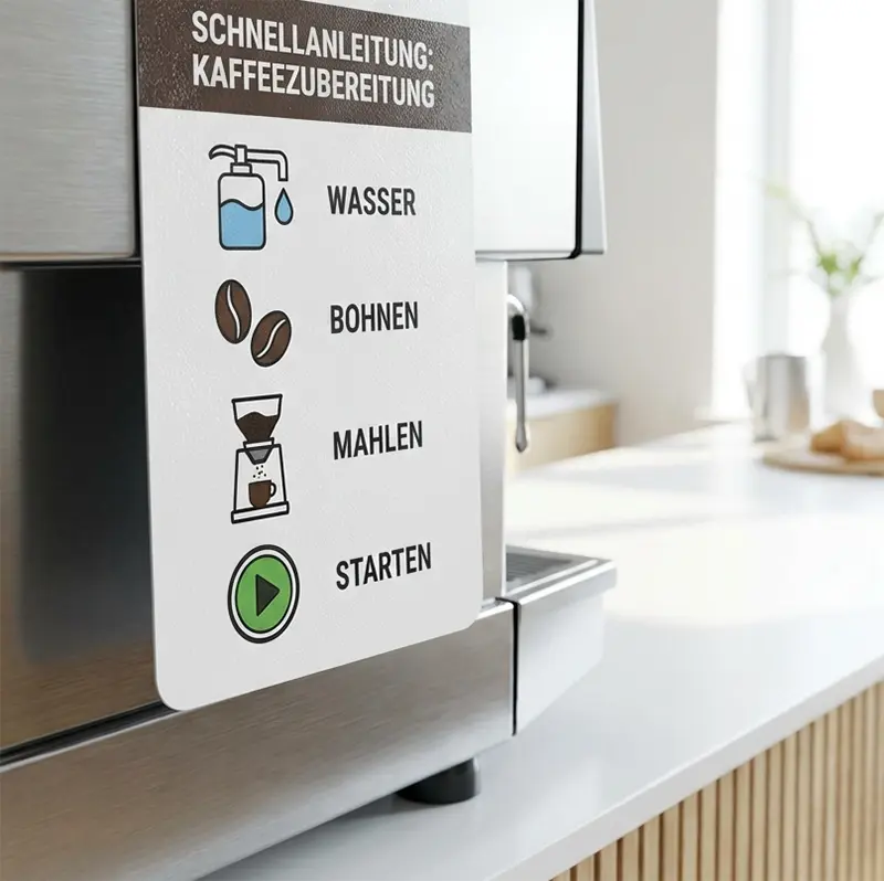 Auch für Bezahlsysteme, Schulungsräume, Kundencenter, Infopoints, usw. sind Anleitungen hilfreich. Gängige Formate sind DIN A4 und DIN A5. Die Ecken runden wir ab, damit sich niemand an einer spitzen Ecke verletzen kann.